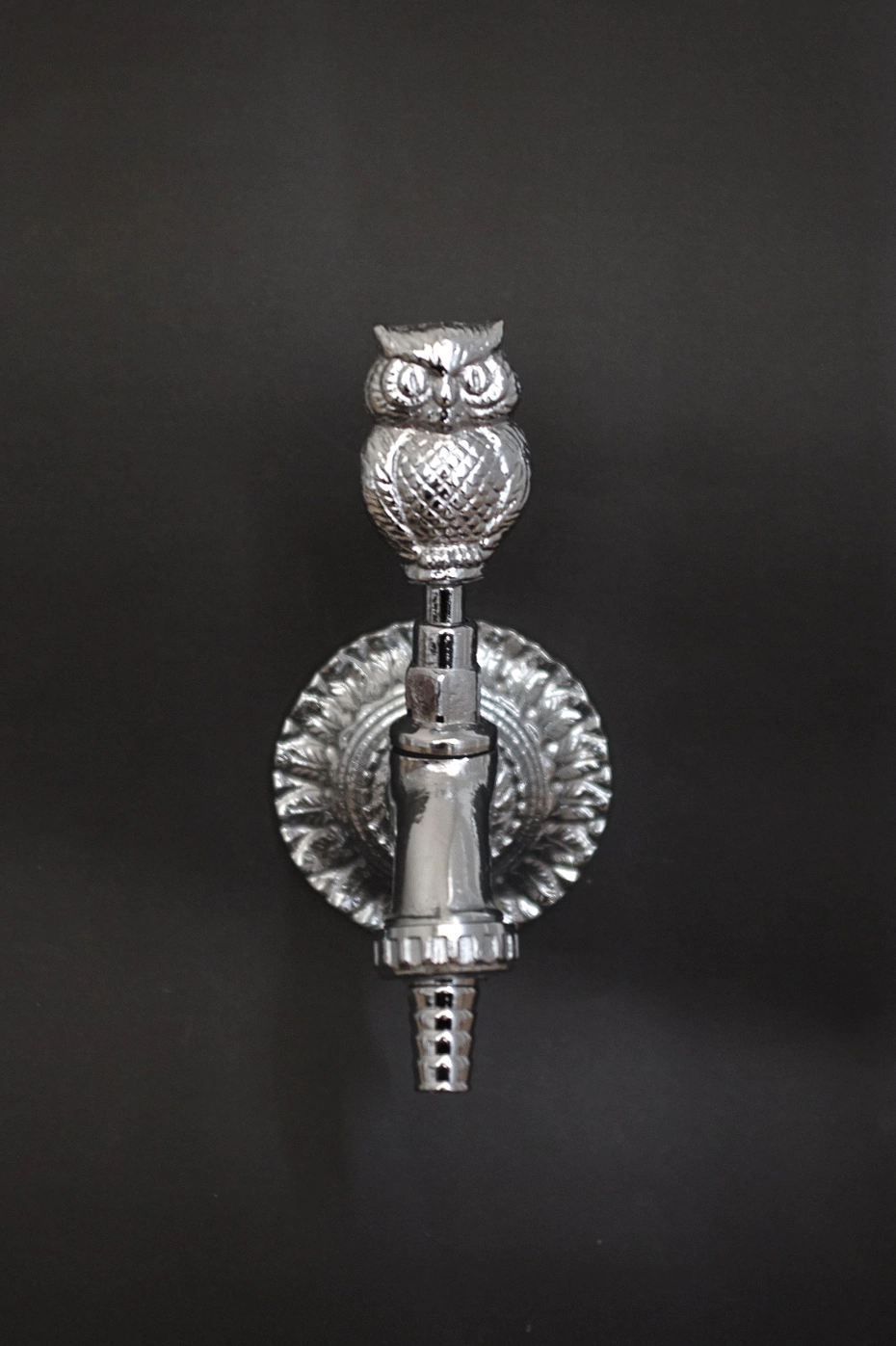 Canilla de exterior con diseño buho fabricado en bronce cromo brillante.