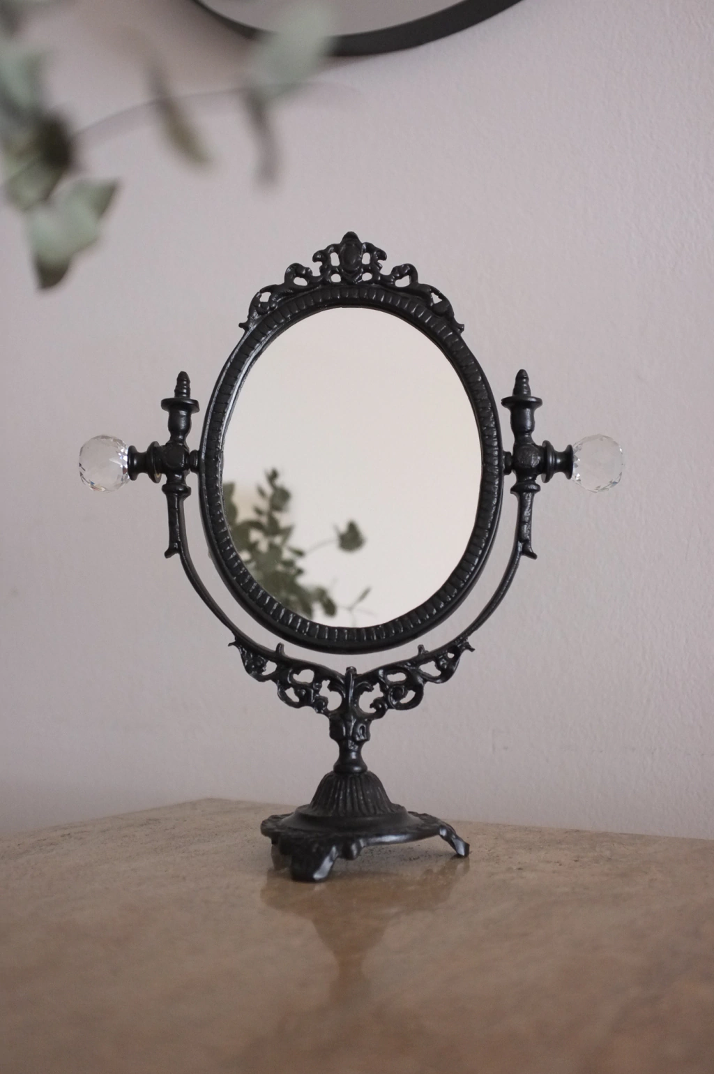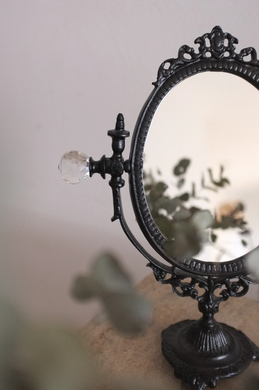 Espejo chico con marco de estilo trabajado en bronce y pintado en negro mate con cristal facetado