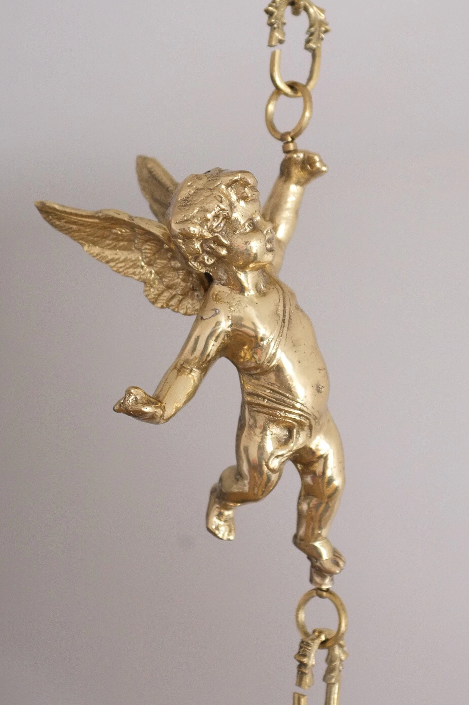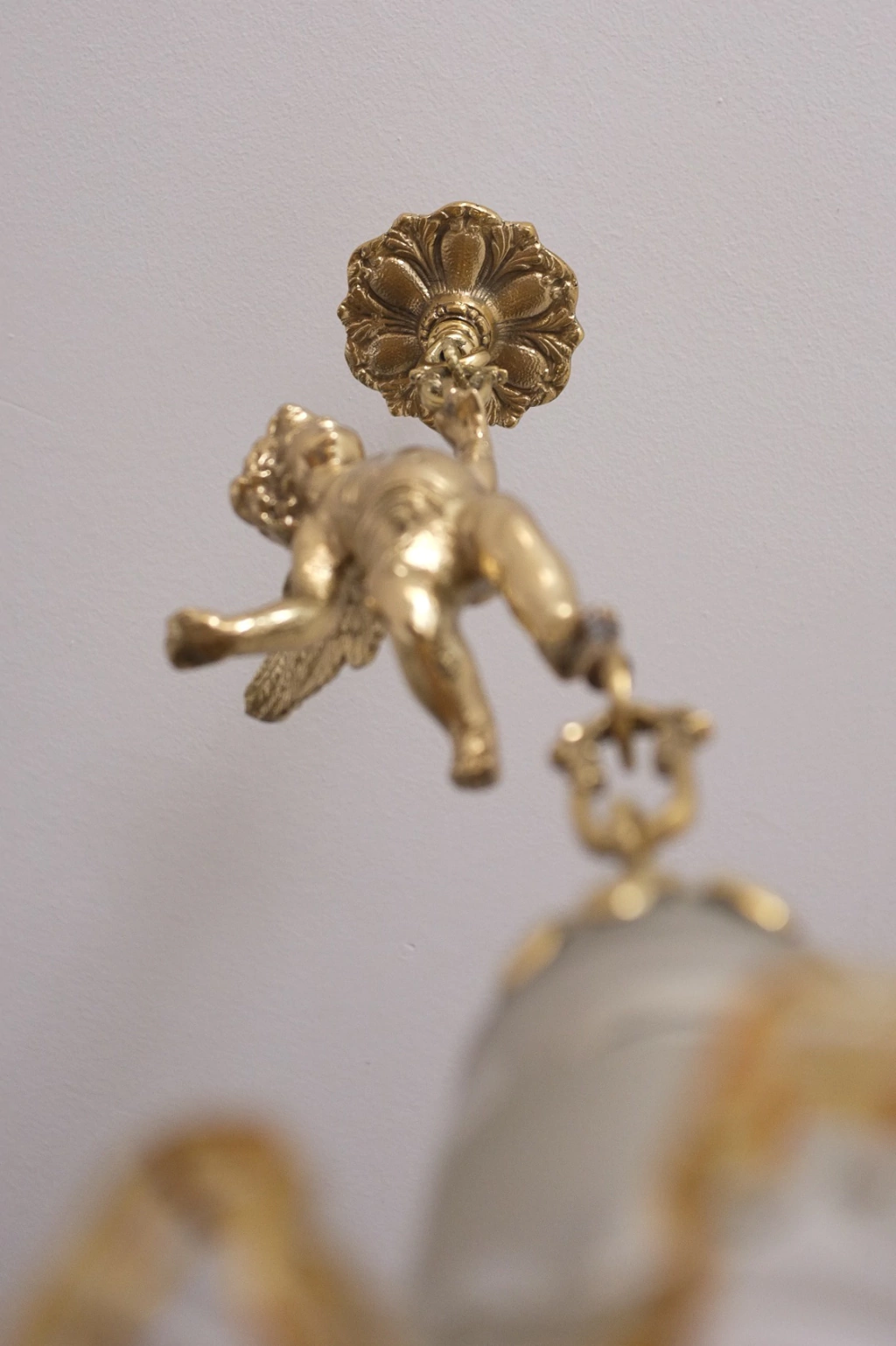 Roseta de estilo trabajada, cadena de estilo, aplique ángel, aplique de luz y tulipa de vidrio.