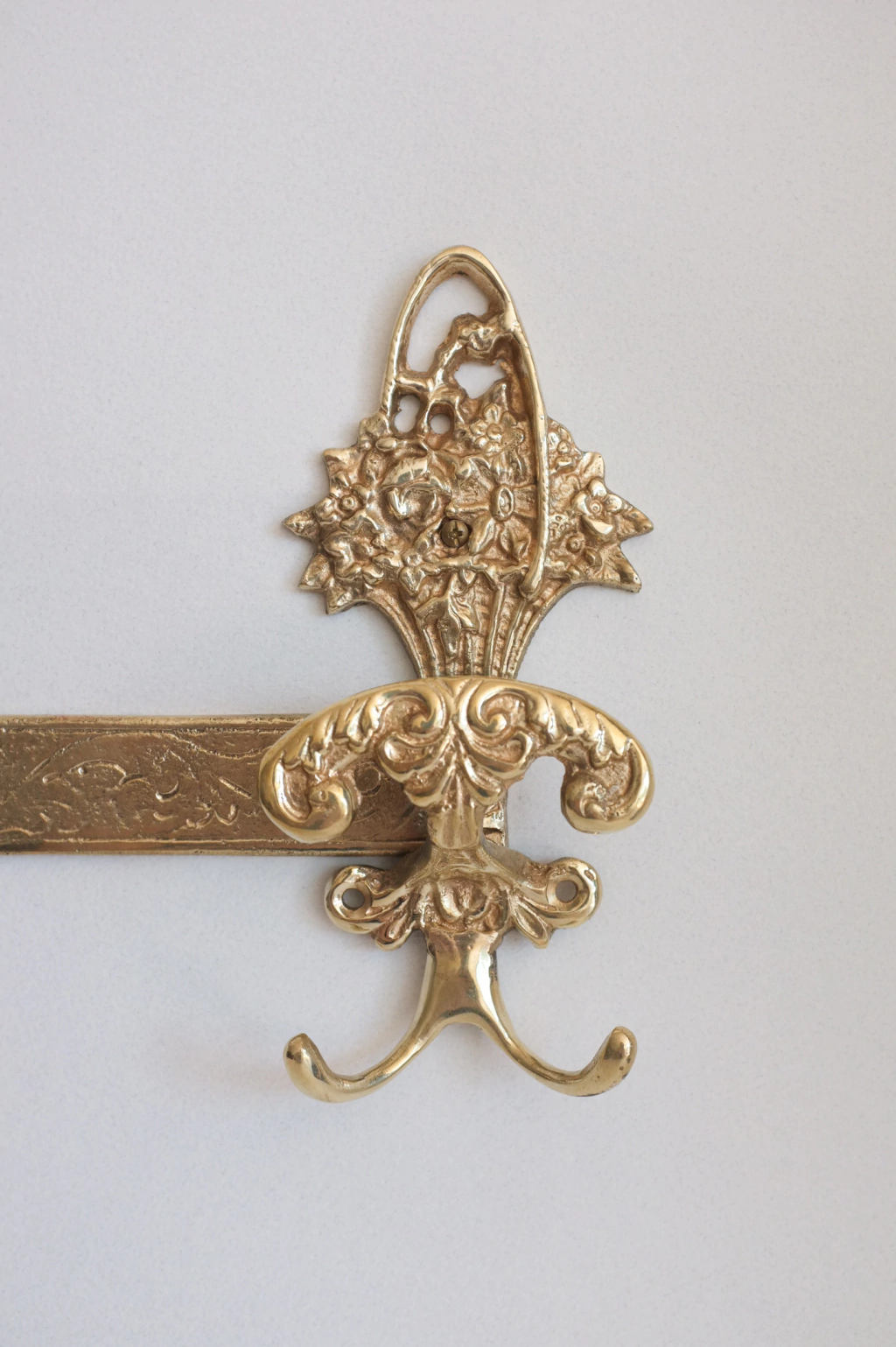 Perchero de estilo fabricaso con doble canastas en bronce pulido, pieza artesanal hecha a mano.