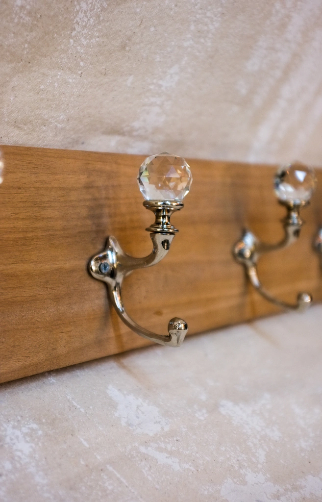 PERCHERO CON BASE DE MADERA CON PERCHAS EN BRONCE CROMO BRILLANTE CON APLIQUE CRISTAL