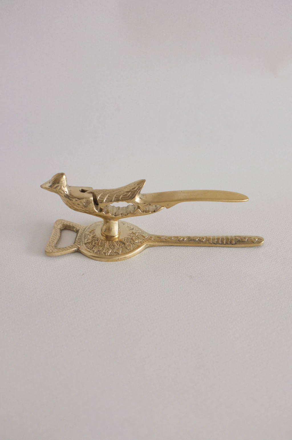 - Diseño: Rompe nueces y abridor con diseño pájaro fabricado en bronce puliudo.