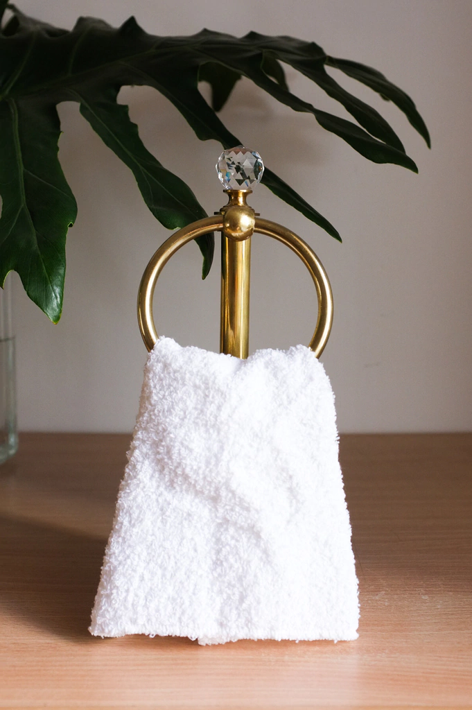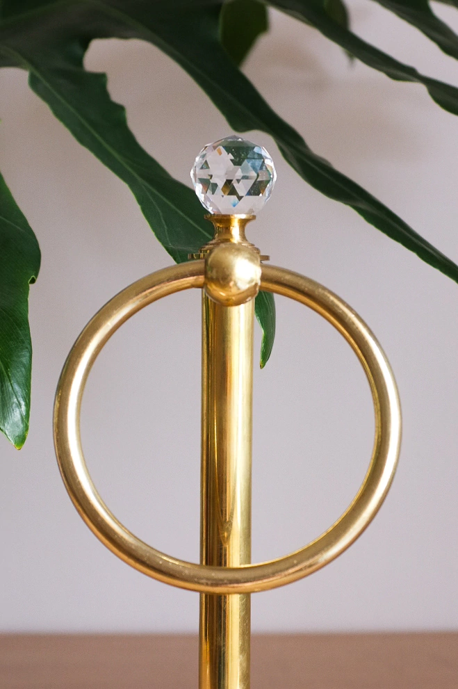 TOALLERO DE PIE CHICO CON ARO Y BASE DE ESTILO FLOR TRABAJADO EN BRONCE PULIDO CON LACA Y CRISTAL FACETADO